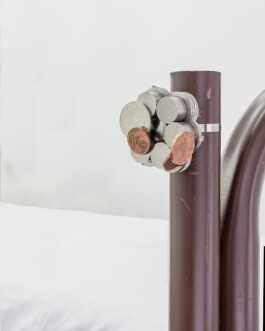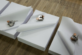 magnets, stainless steel, polystyrene glass, A4 paper, found objects (coins, keys, fève from a king cake)